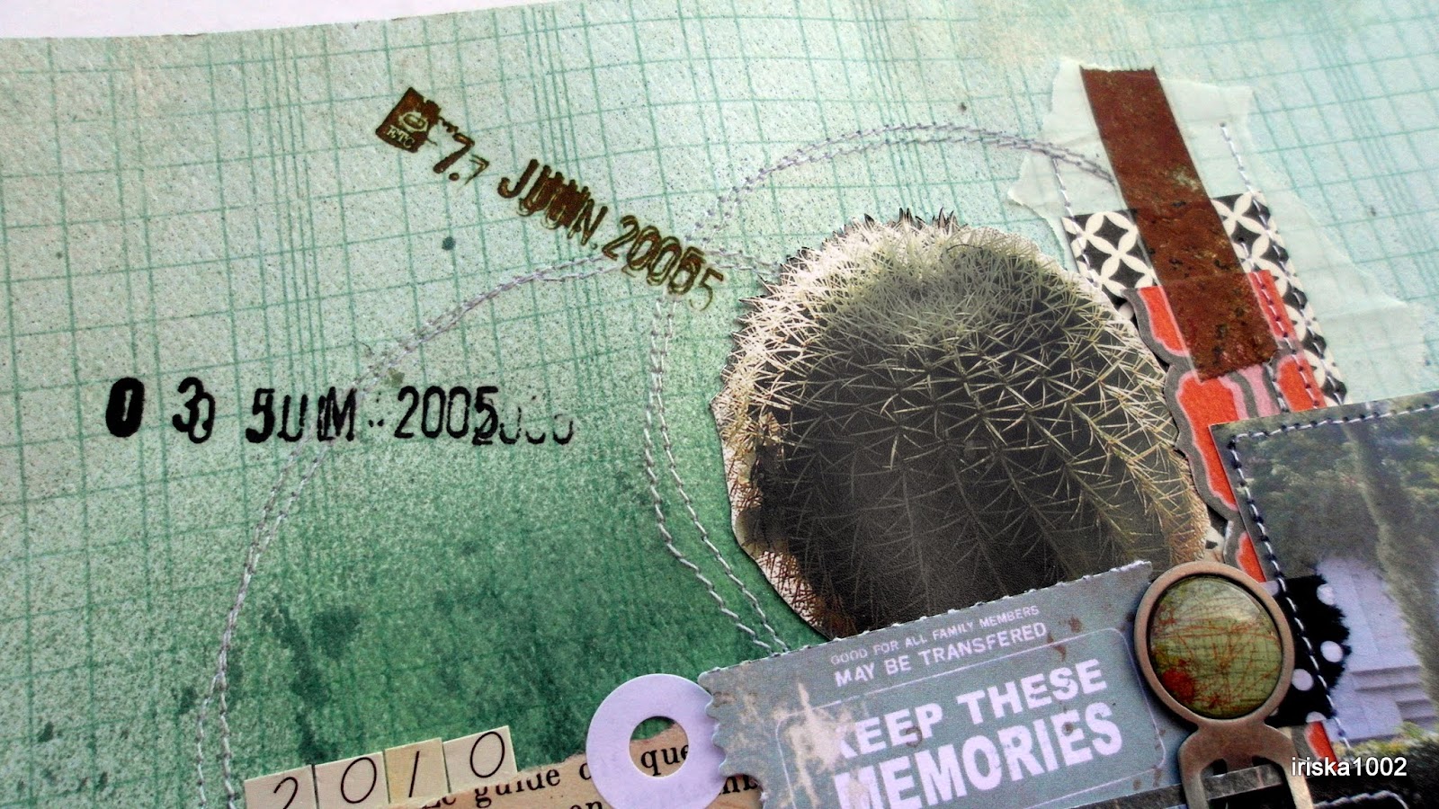 Один круглый кактус я вырезала, нашила кругов, чтобы его поддержать, а натирки-даты - как колючки времени, которое уходит в прошлое... Натирки все от БоБанни, бумага и все кусочки от ММЕ, даже брадс все от ММЕ и круглая скрепка от них же... Добавила немного машинной строчки и вот страничка готова!